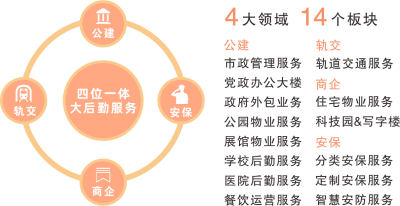 綠清戰(zhàn)略推進“大物業(yè)”“大后勤”服務,深度融入“大格局”,構建公建、軌交、商企、安保“四位一體、大后勤服務”的多業(yè)態(tài)協(xié)同戰(zhàn)略。業(yè)務涉及:市政管理、黨政辦公大樓、政府外包業(yè)務、公園、展館、學校、醫(yī)院、機關食堂,以及軌道交通、住宅物業(yè)、科技園區(qū)、寫字樓、安保服務等諸多領域,為美好生活提供一站式大后勤服務保障。